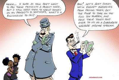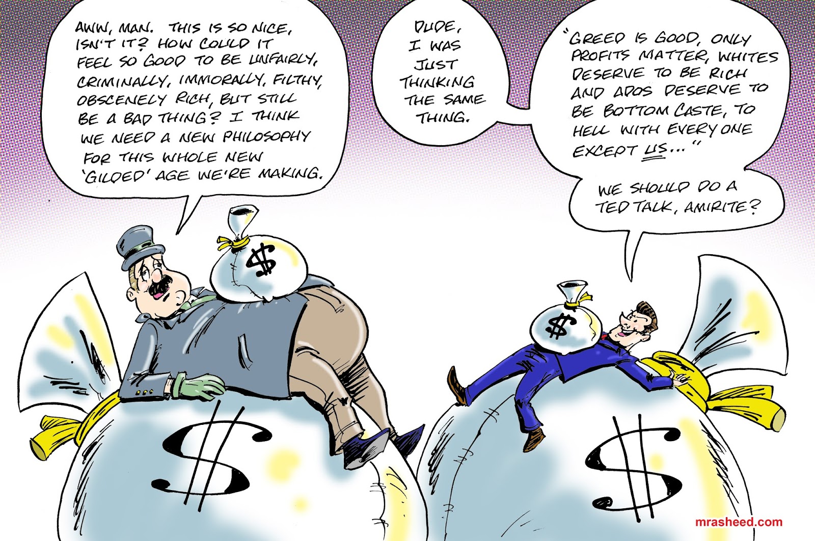Rasheed, Muhammad. "The Self-Serving Pseudo-Philosophy of the One Percent." Cartoon. The Official Website of Cartoonist M. Rasheed 28 Feb 2020. Pen & ink w/Adobe Photoshop color.