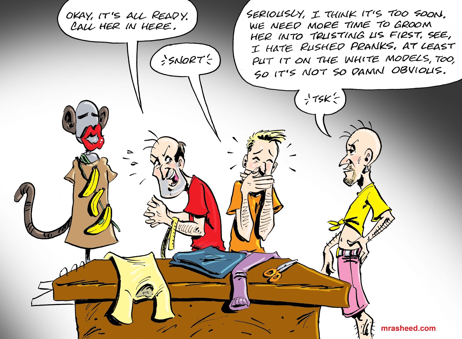 Rasheed, Muhammad. "Racist Mockery, Fake Apology, Repeat." Cartoon. The Official Website of Cartoonist M. Rasheed 23 Feb 2020. Pen & ink w/Adobe Photoshop color.