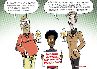 Rasheed, Muhammad. "Media Campaign to Sabotage Anti-Racism Activism." Cartoon. The Official Website of Cartoonist M. Rasheed 21 Feb 2020. Pen & ink w/Adobe Photoshop color.