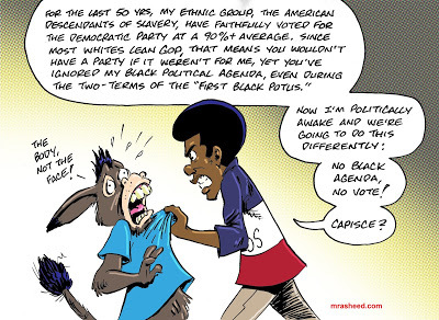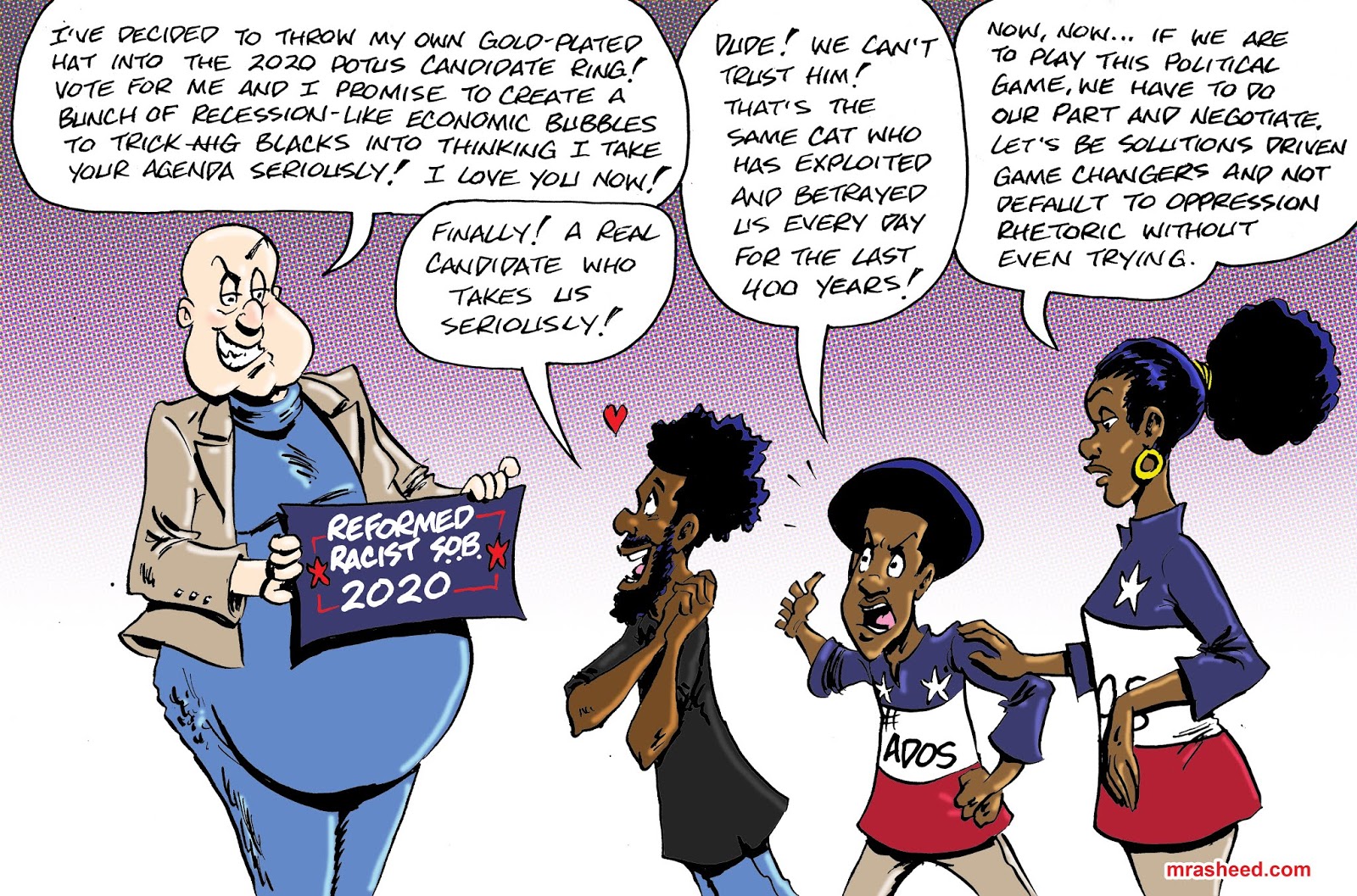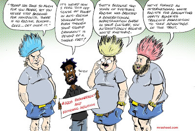 Rasheed, Muhammad. "Threatening the Post-Racial Fantasy." Cartoon. The Official Website of Cartoonist M. Rasheed 17 Jan 2020. Pen & ink w/Adobe Photoshop color.