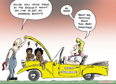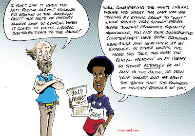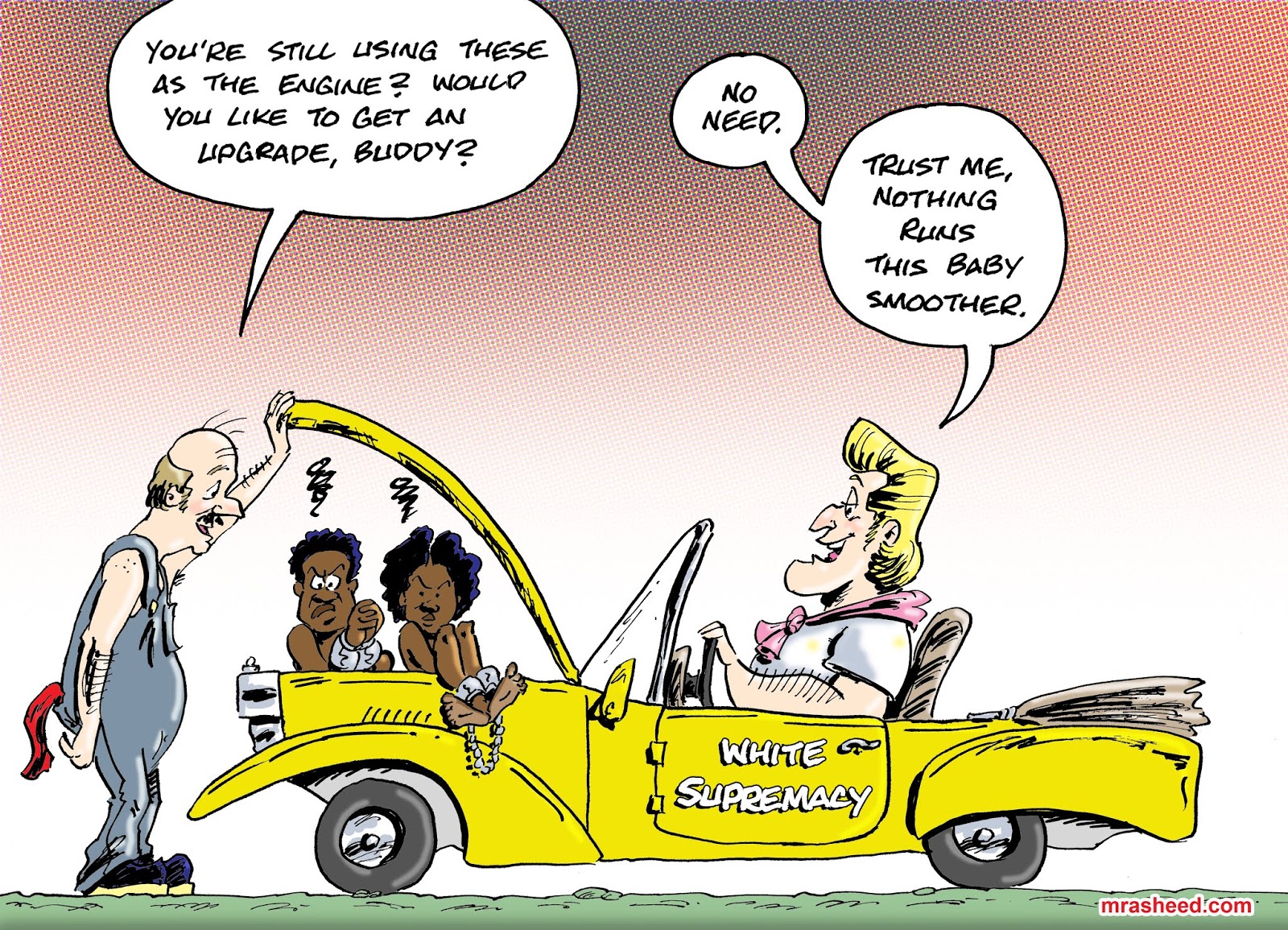 Rasheed, Muhammad. "Skinfolk Attacks on Truth Supports White Supremacy." Cartoon. The Official Website of Cartoonist M. Rasheed 11 Feb 2020. Pen & ink w/Adobe Photoshop color.