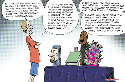 Rasheed, Muhammad. "Cheap Soul for Sale." Cartoon. The Official Website of Cartoonist M. Rasheed 11 Feb 2020. Pen & ink w/Adobe Photoshop color.