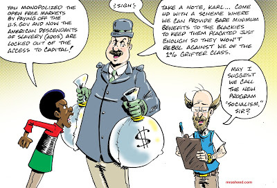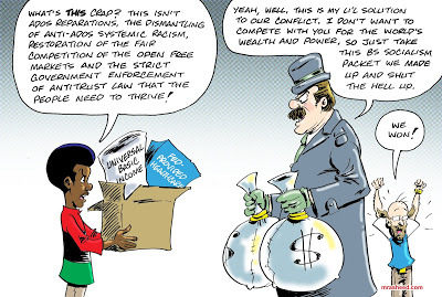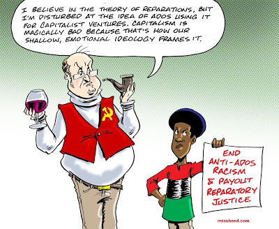 Rasheed, Muhammad. "The White Liberal's Classic Attempt to Cancel ADOS Reparations." Cartoon. The Official Website of Cartoonist M. Rasheed 01 Sep 2019. Pen & ink w/Adobe Photoshop color.
