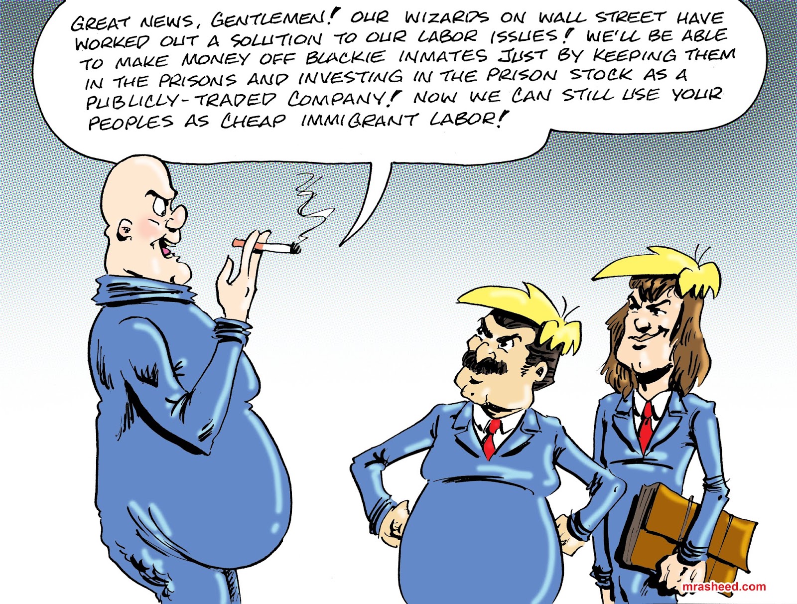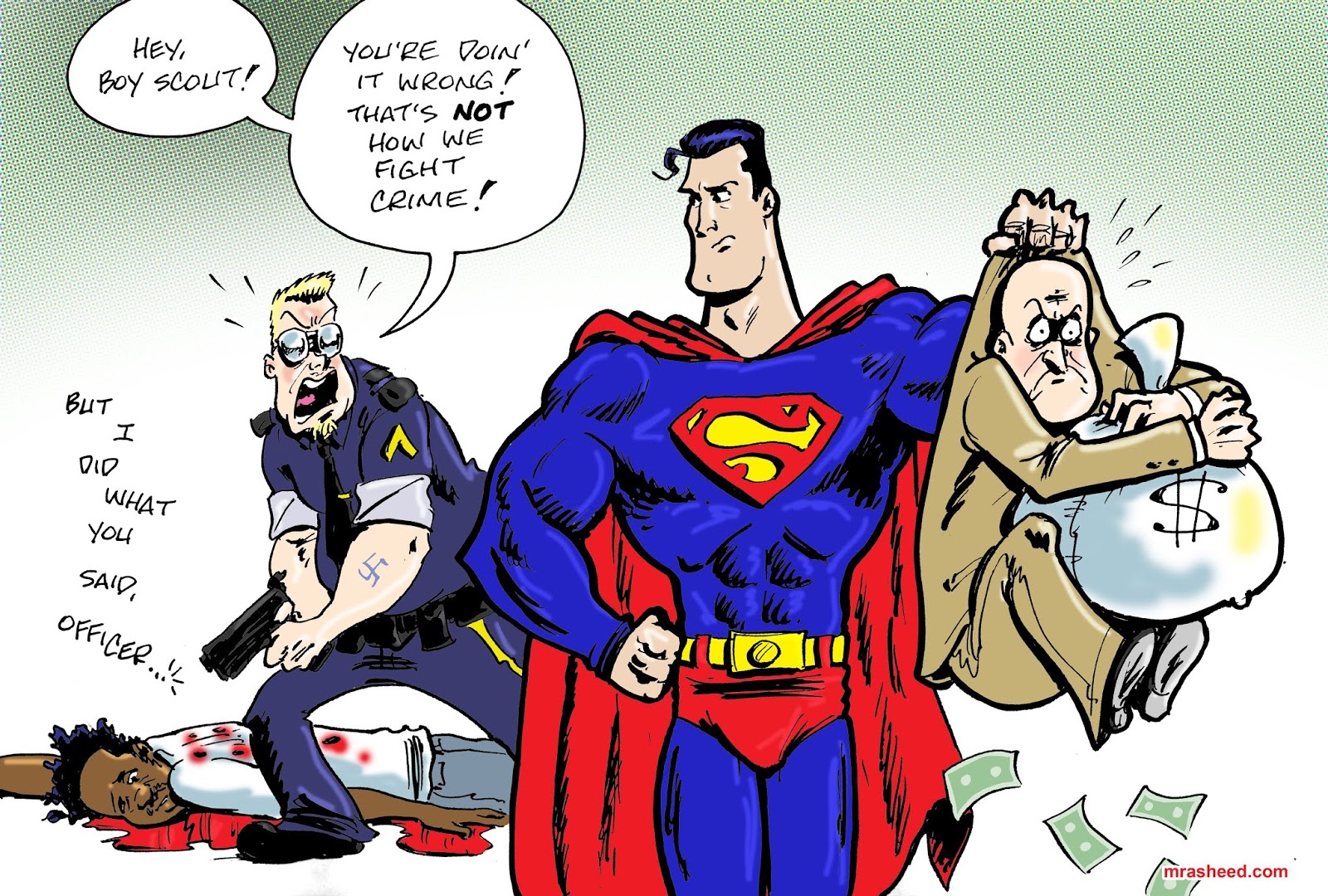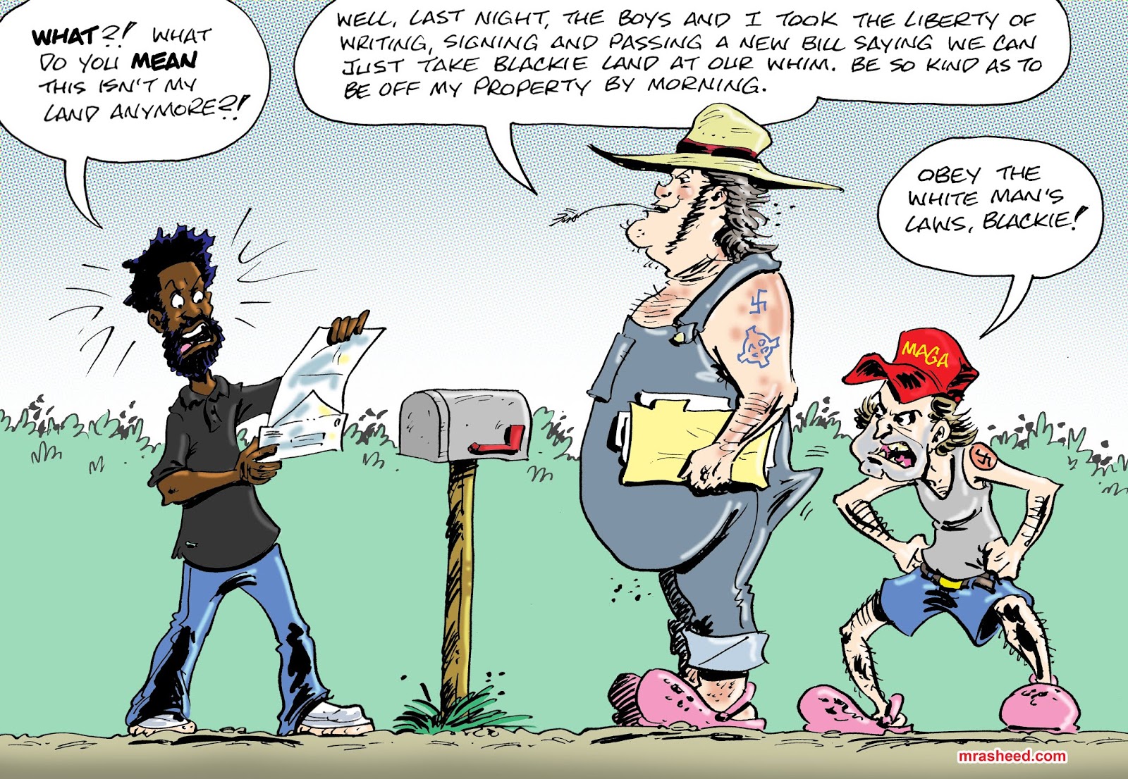 Rasheed, Muhammad. "Racism's Filthy Molestation of Legality." Cartoon. The Official Website of Cartoonist M. Rasheed 13 Aug 2019. Pen & ink w/Adobe Photoshop color.