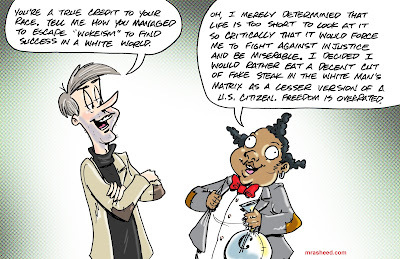 Rasheed, Muhammad. "When Getting White People to Like You is More Important than Justice, Fairness & Righteousness." Cartoon. The Official Website of Cartoonist M. Rasheed 06 Nov 2022. Permanent marker w/Adobe Photoshop color.