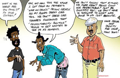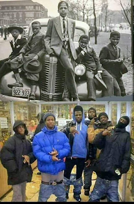 Denise Johnson - @Muhammad... I agree but in the photo of a prior generation, the young men were taught by the black men in the community how to be appropriate in their mannerisms and dress. This was in the face of severe adversity. Where is the protection for one another in this circumstance? We know our communities are constantly attacked and exploited but why were other males not communicating the degradation of this so called fashion style to the young men in the community? The corporations and media are at blame but not as much as the fathers and other black males in the community who appear to be absent in influencing the younger generations.