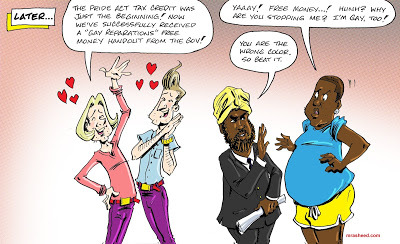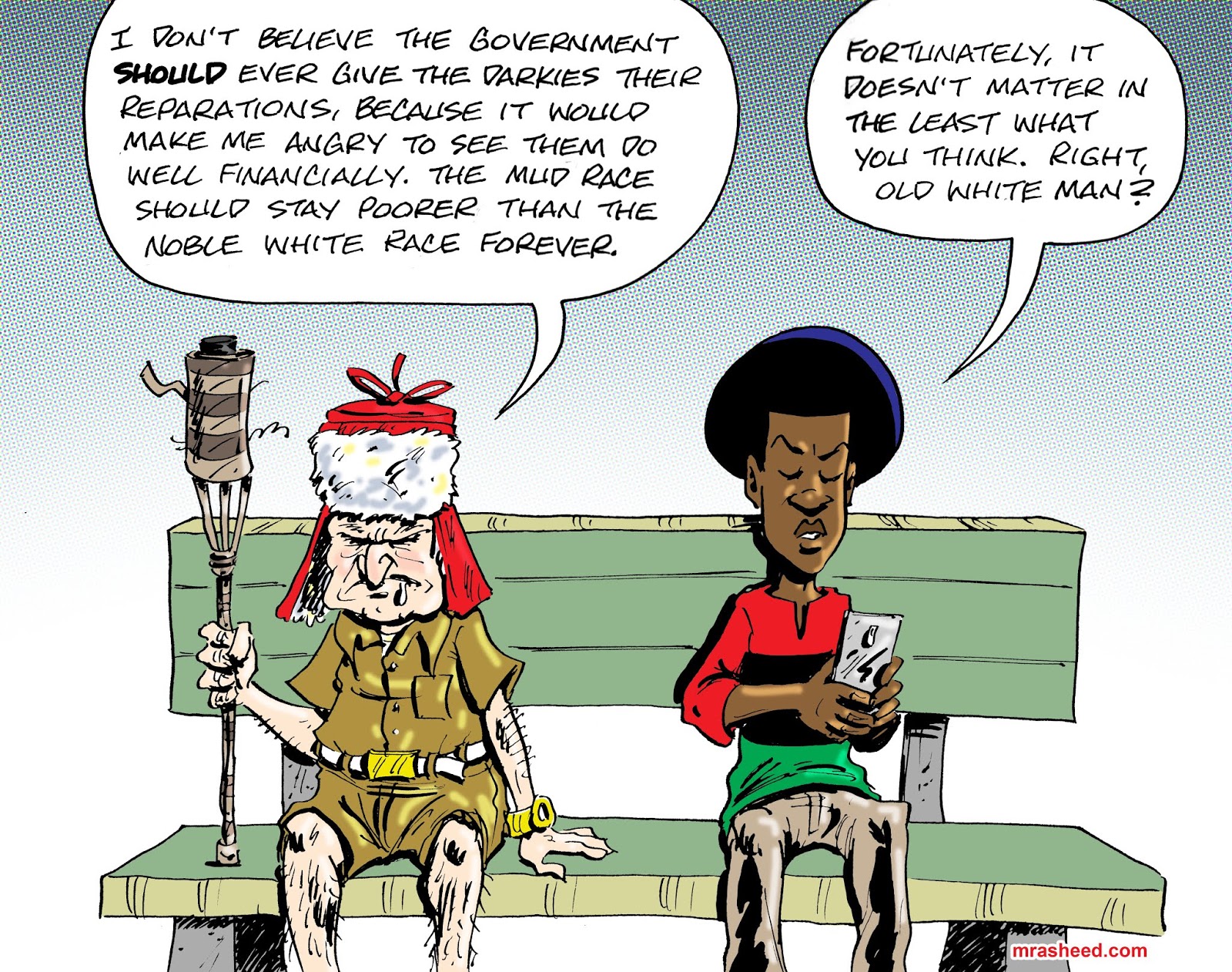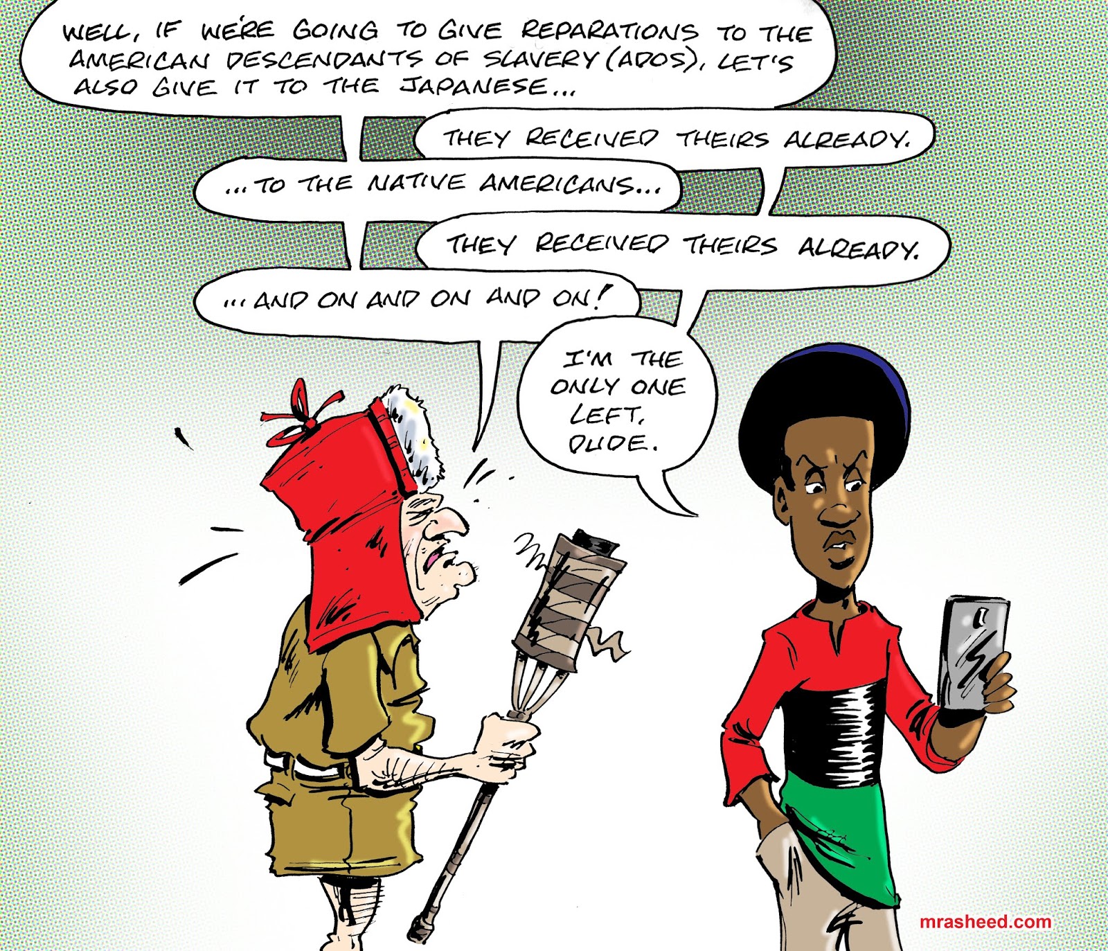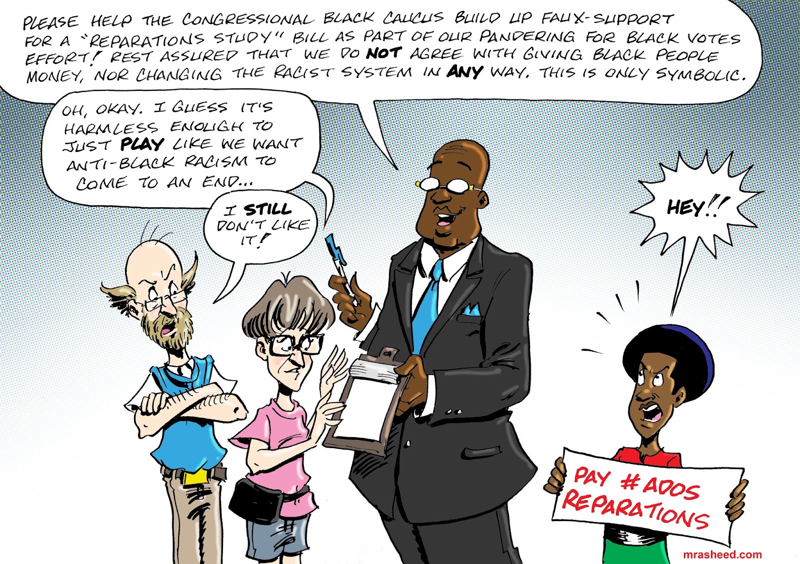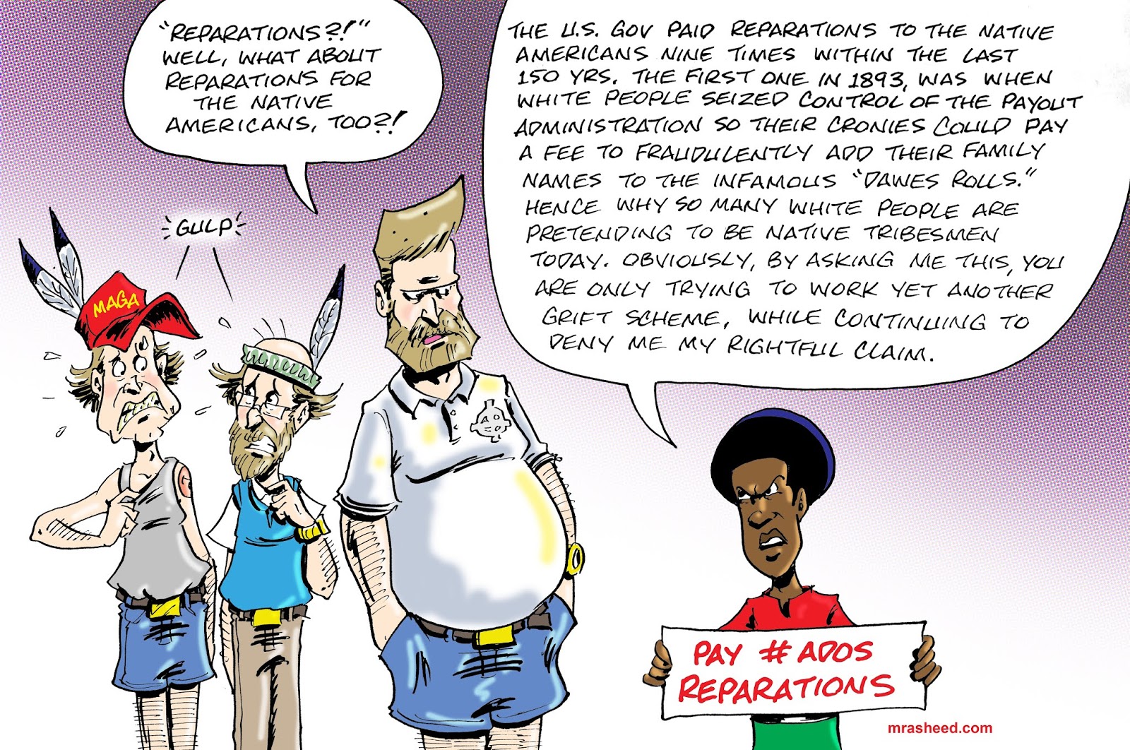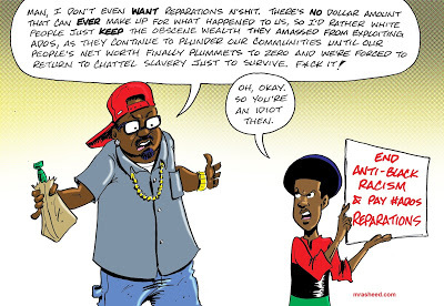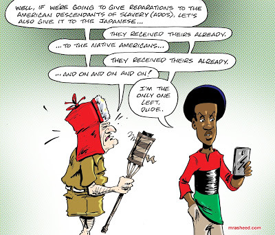 Rasheed, Muhammad. "Zero Credibility from the Anti-Reparations Critic." Cartoon. The Official Website of Cartoonist M. Rasheed 04 Aug 2019. Pen & ink w/Adobe Photoshop color.