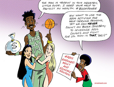 Rasheed, Muhammad. "Missing in Action: The Political Force of Black Celebrity." Cartoon. The Official Website of Cartoonist M. Rasheed 09 Aug 2019. Pen & ink w/Adobe Photoshop color.