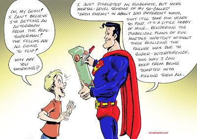 The most credible way to write Superman stories is to use your embarrassingly dormant IMAGINATION to friggin’ INVENT appropriate challenges that match the Kryptonian’s power levels and push all of the mere mortals to the back of the stage to sit in their proper place as props and doorstops.