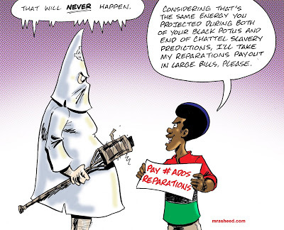 Muhammad Rasheed - The Reparations agenda item is being discussed by the 2020 presidential candidates because of strong and consistent grassroots activism by the #ADOS movement. The application of forceful political pressure, threatening to withhold the potent vote of the American Descendants of Slavery from the party and other effective techniques as leveraged through organized and passionate political efforts, can often make what may seem impossible to those used to zero movement in social progress shockingly possible.