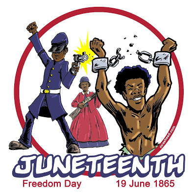 Rasheed, Muhammad. "Celebrate Juneteenth 2019." Cartoon. The Official Website of Cartoonist M. Rasheed 19 Jun 2019. Pen & ink w/Adobe Photoshop color.