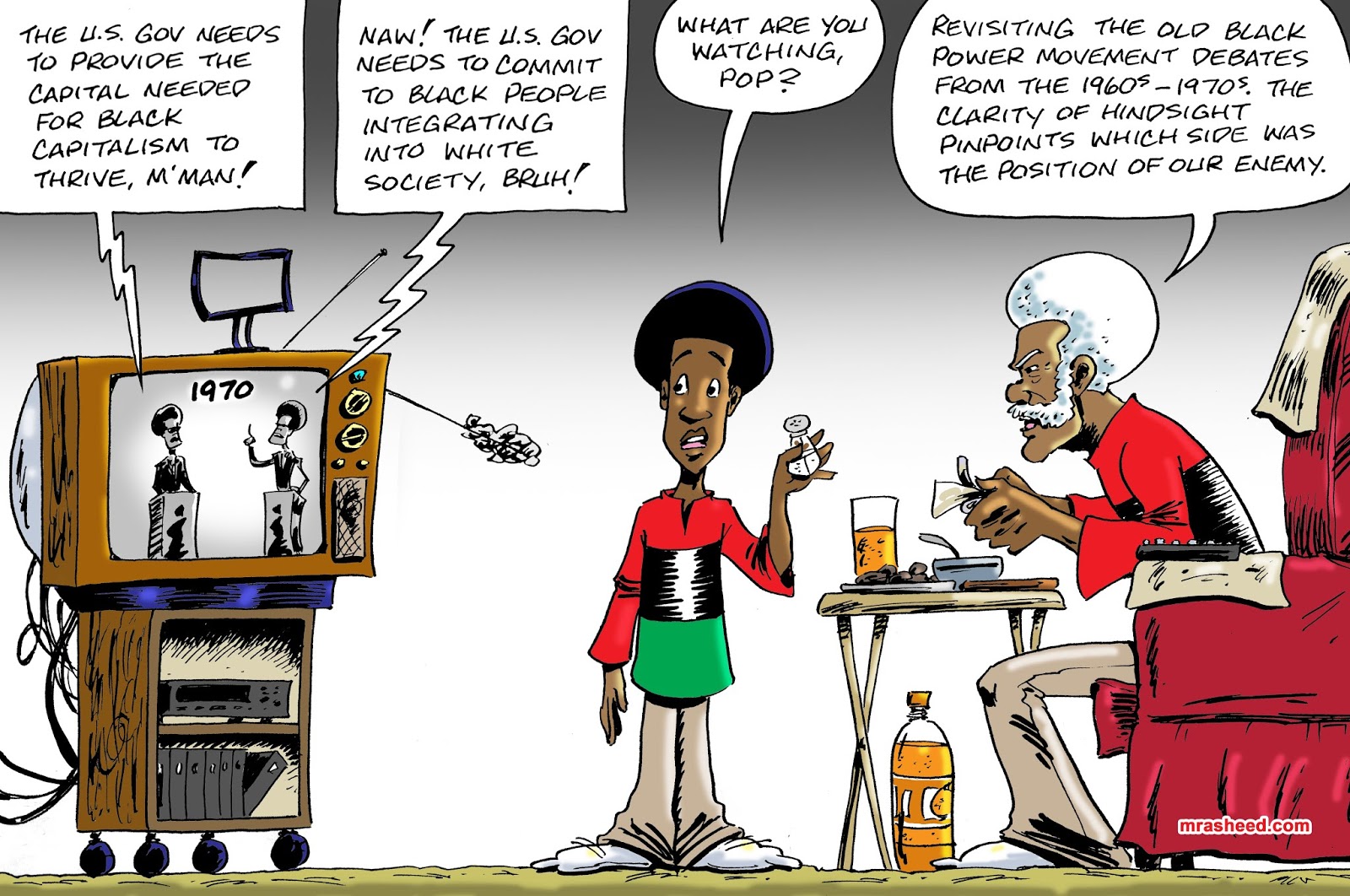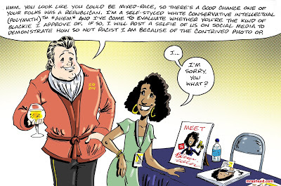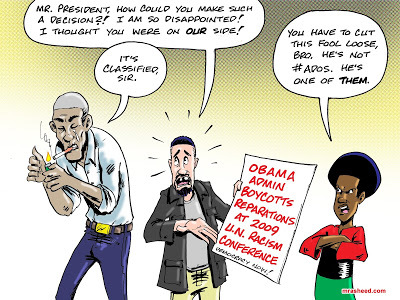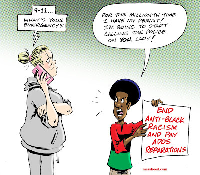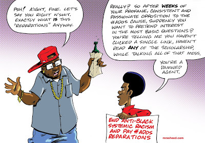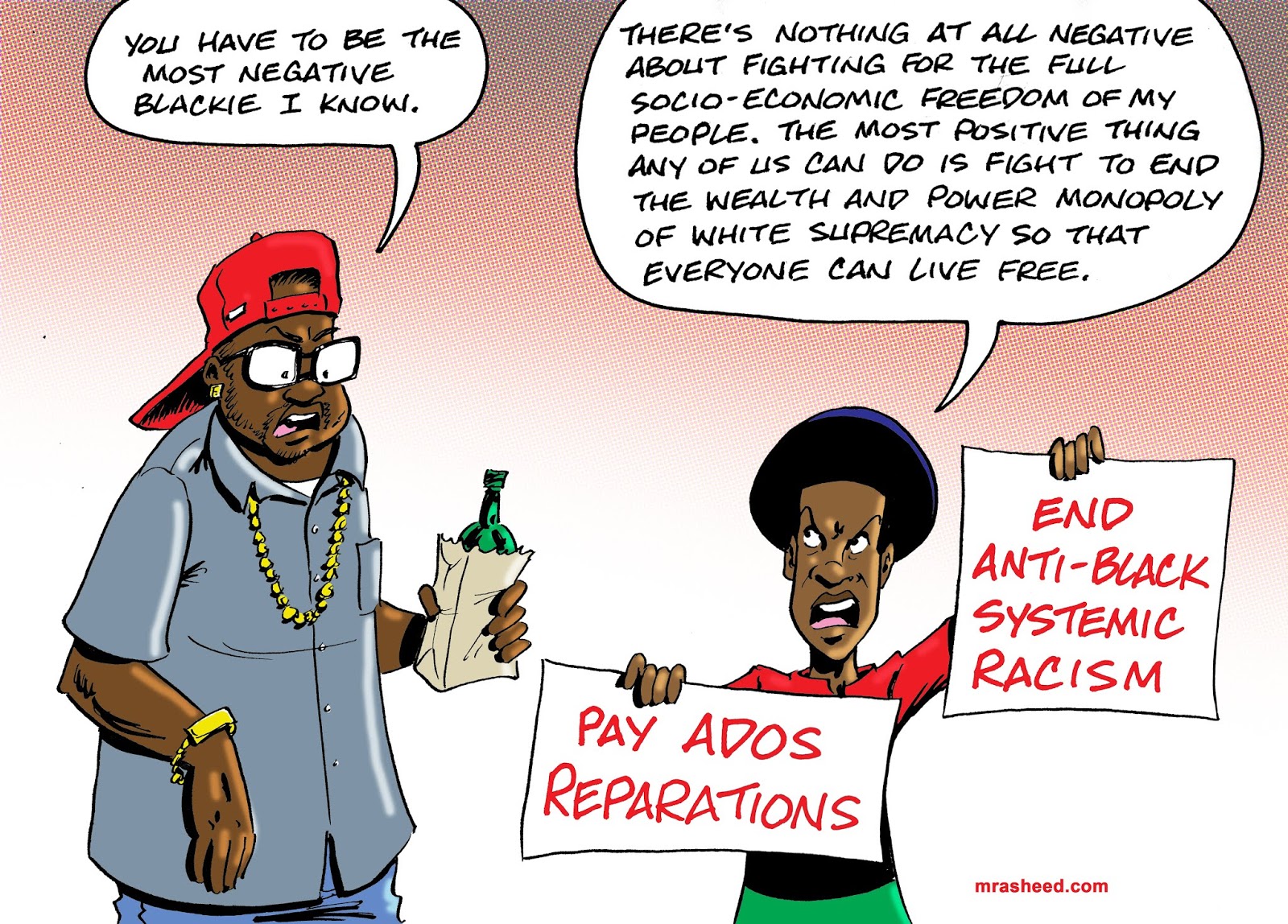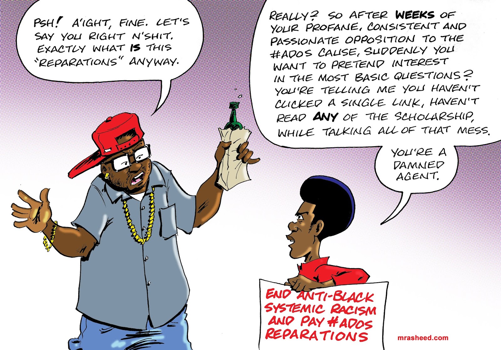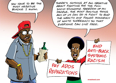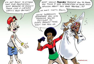Rasheed, Muhammad. "Idiot's Demonstration of a Coonish Defense of the Anti-Black Status Quo." Cartoon. The Official Website of Cartoonist M. Rasheed 20 May 2019. Pen & ink w/Adobe Photoshop color.