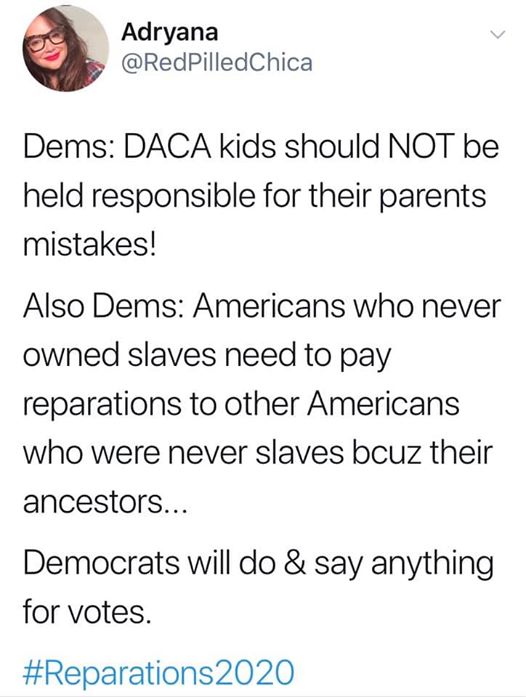 #Reparations2020 is owed to ADOS for 400 yrs and counting of demonic economic racism inflicted upon them by your demographic & friends. It's time to fix it.
