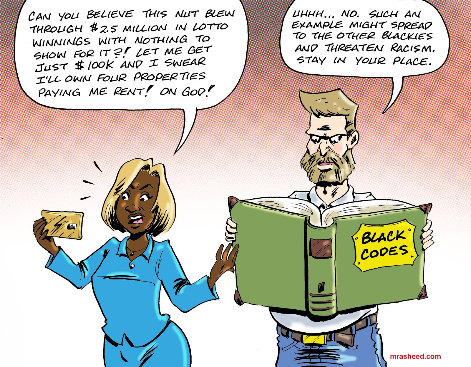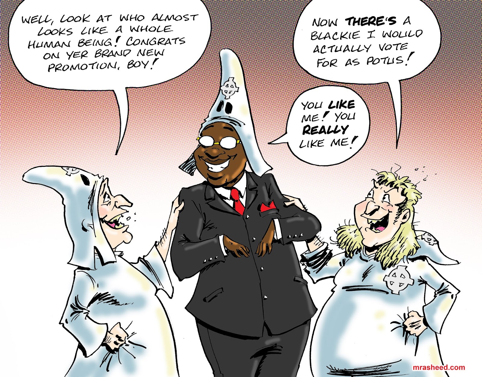 Muhammad Rasheed - I'm also interested in the implication that a Black man isn't considered a human being until he sells out to the rival white race. That's worth exploring all by itself, really...