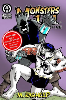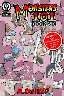 In this latest issue of the Monsters 101 graphic novel series, we have several new plot threads building all at once, from the introduction of a dangerous new human turned way-more-than-human villain to a humorously morbid side story that would greatly appeal to fans of the Goon comics from Eric Powell, to Mort coming closer in his quest to find the Golden Order of the Encircled Serpent. Pugroff is king of the monsters, officially, and Mort is advancing startlingly well on his mystical journey. Rasheed's plot structuring changes here though, I think, with the individual sub-chapters becoming less clearly continuous in execution, though obviously still relating from one to the next. These feel more like collected stories than did previous issues, as opposed to mammoth-sized ones, and this actually works well for expanding more individualistic character developments, as each chapter can stray more liberally. There was an especially great segment in the middle full of Ditko-styled sorcerous action, and dark plot thread unravelings straight out of Lovecraft. This includes some pretty incriminating insinuations for the future of Pugroff. The book ends on an almost abrupt point, following something quite dramatic that had been building among certain characters since day one. There will likely be intense ramifications from this, intense ramifications from much of what transpires in this issue. The art is mayhaps the darkest yet, as gruesome fighting between subhuman creatures is sure to demand. Rasheed proves himself time and again in his ability to draw any setting that the truly imaginative story calls for, from urban and small town city streets to alien landscapes to monsters right out of your own childhood nightmares to crazy super-powered folks to little kids eating candy bars to normal adults having very racially-charged arguments. Expanding on that, I am beginning to wonder if a subversive meme to this series is to entail that all creatures great and small, all are monsters in their own way. Another damn better than good issue, and with number seven nearing release, I am honestly saddened that the series will conclude later this year with number ten. Anyone following Monsters 101 would be. At approximately 150 pages per ish, this is a ton of story, and it's an original and compelling story at that, loaded with realistic character growth and scary, scary monsters. Go to Rasheed's blog or website for information on how to stock yourself on a comic that is worth light-years more than Diamond Steve Geppi's value system.