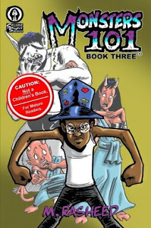 The third chapter in the Monsters 101 series of graphic novels continues the otherworld adventures of Pugroff and Mort, with Mort taking the lead role as his thirst for magical powers lands the two deep in the heart of devil country. While Mort's one-track obsession may be endangering their well-being, the boy magician and the boy monster together prove themselves ready for just about anything. Pulled into the inner circle of the devil royalty through valorous deeds, Mort and Pugroff meet new friends and enemies as the ongoing exhibition of monsters (and what the term may ultimately imply...) continues through incredible pages of imagination and clarity of vision. Rasheed is really impressing the heck out of me with his series. Along with keeping his main characters, regardless of physically and emotionally monstrous changes, portrayed as preteen children still, his storytelling can encompass everything from quite humorous bantering back and forth between Mort and Pugroff on up to establishing a massive new cosmology that mixes the Greek poet Hesiod with Milton and Gaiman. Granted, each issue of this is roughly 150 pages or so, but he has already built foundations for a universe here, along with enjoyably realistic heroes and villains. While Pugroff is still an oversized bully turned nightmarish brute, Mort as well is showing himself to be something not quite normal or necessarily hero or villain. A curious pair. If anything, one can surmise by this point in the narrative that indeed all heroes and villains are still monsters to somebody or other. Like Oscar Wilde once said, "Every saint has a past and every sinner has a future." The good guys and the bad guys are all subjective terms, as anybody can turn on a dime, and any hero can have a hero of their own to look up to and any villain can have a villain of their own to be scared to daisies of. I was actually wondering if certain suggestions in the story were going to be left unacknowledged, until the awesome (and tragic) Pherlyren stepped in and laid down the law while pointing the direction the overall story will take. Real neat developments, with the coming quest for Shemesu Heru, the Followers of Second Sight. The art is very nice and portrays some genuinely psychedelic subject matters later on as Mort experiences the altered states and altered dimensions of the path for magical awareness. Very mature stuff, and very engaging representations of things straight out of dream. Lots of forethought is clearly going in to the design and moods of his characters, his settings and his panel-flow. I grew up reading a lot of comics with Milgrom and Sinnott in the credits boxes, and I think Rasheed may have too- in a very, very good way! This is an excellent segment from an excellent line of books. The line about the Black Panthers particularly cracked me up. This story of young monsters infers things that you just don't read of everyday, and for that Rasheed is doing a royally bang up job.