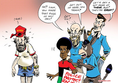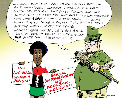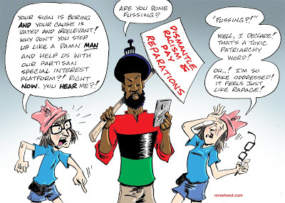 Muhammad Rasheed - Today's daily editorial cartoon is just a caricatured parody of an 8 page rant someone posted under one of my cartoons yesterday. Nothing special, just something typical from people who assume, for whatever reason, that my little Activist character is actually a drawing of me. Because of this I tend to get these people who approach me thinking they will be able to exert a strong-willed, dominant maturity influence over whom they believe is just a precocious kid whose powers they can steer to support their own agendas (presumably while also grooming me for molestation or whatever). Once they find out I'm 50 yrs old, they mutter something semi-coherent and then slink back into the shadows of their Whitopia.