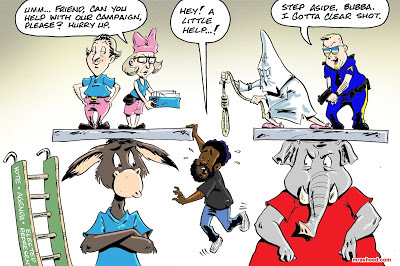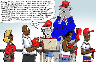 Black people will be heavily discouraged from consolidating their socio-economic power and seeking to control their own political destiny which will be the only way the will achieve their ultimate empowerment and economic inclusion goals of true equalityBlack people will be expected to give up all dreams of full citizenship in the USA, and it will be understood that they will be delegated to a permanent second class, supporting the white racist aristocracyBlack Republicans will be expected to take on the “Racism is a fiction! It’s all about culture!” rhetoric and turn a blind eye to abuses other Black groups receive that will in effect subjugate and exploit them to feed the white racist aristocracyBoth white liberals and white conservatives are pro-racism, they merely express the issue in different ways. The liberal dangles empty anti-racism & Black Empowerment promises like the proverbial carrot, but has zero intention of helping Black people achieve these goals as they will distract from their own political aims. The white conservative is traditionally more blunt about his anti-Black hatreds (although he has learned to take on a crude ‘code’ to mask his public face in the ‘politically correct’ era which he loathes), and neither party offers what Black people really need—both representing a lesser of two evils position: