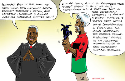 Muhammad Rasheed - It wasn't Thomas' "fiery" attempt to twist the accusations into a political grounds based partisan attack that I remember most, but how the Republicans were trying to replace Thurgood Marshall's old SCOTUS slot with a white conservative in blackface, all while dismissing Hill's testimony as an annoying inconvenience to their schemes.