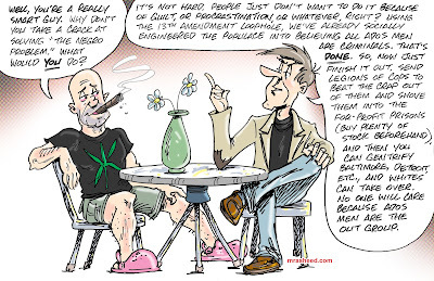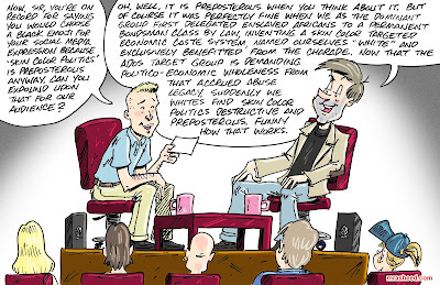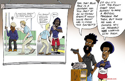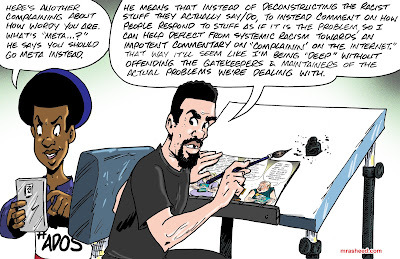 My ethnic group is an artificially impoverished bottom caste in our own country because of centuries of systemic racism, and here I find a congregation of white supremacists spinning my work into self-serving, cock-eyed racist messages for their amusement. It was a great find because I'm committed to making editorial cartoons about anti-racism topics so it's easy to just respond back to things my ideological foes say. They get to be their usual evil, asshole selves and I get ready inspiration to produce my art. It's a win/win, really. The fact that there are so many regular shrines over there to MY work, means I'm living rent-free in their heads, right? And oh, look. You are here, too. 😁🤣