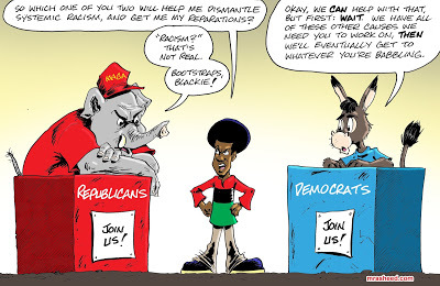 The Democratic Party is composed of numerous sub-party special interest groups, each using its political savvy and influence to push for their particular agenda list. The African American community, oddly, lacks a focused *Black Political Agenda* to push for their own special interest item of dismantling systemic racism (with its corresponding payout of Reparations justice), so in order to have something to do, the Black politician signs up to work on the agendas of rival interest groups or just works for the party itself.