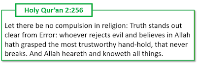 What Allah DOES say however is that HIS punishment for such a decision will be hellfire. In the Qur'an, the One God of Abraham says that He will not accept any other religion from one who once accepted the truth of Al-Islam, and then rejected it. Such a deed makes one a "transgressor of faith," and Allah uses language that makes it clear He considers the transgressor to be the most vile of all the hellbound. Yet Allah gives even these foolish people respite, and says several times that if they repent and turn back to Al-Islam, He will indeed forgive them. So how could that situation happen, and the unwise have the opportunity to save themselves per Allah's merciful policy, if the very wrong and misguided Muslims attack and kill the person because they decided to convert to something else? It is obvious that this is why Allah said "there is no compulsion in religion," because it is He who knows and you who know not.