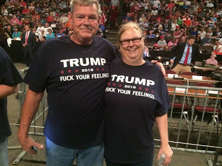 Muhammad Rasheed - So are you saying you strongly condemn the "Fuck your feelings!" message from this proud Trump campaign event photo, and personally never partnered with it at all from your own very public, hypermasculine, white conservative "Fuck your feelings, libtards!" position? *thoughtful*