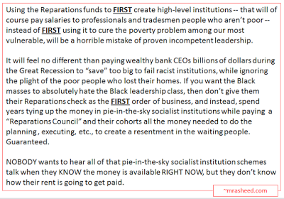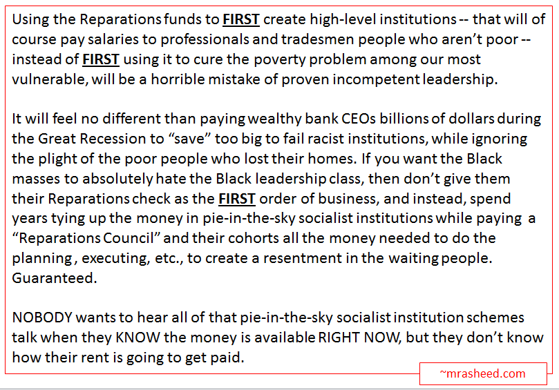 Muhammad Rasheed - Well, in this context, curing Blacks of perpetual poverty is supposed to be the primary purpose of the Reparations program.