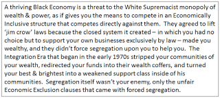 So even though forced segregation was bad, it was still better than Integration (see: Philando Castile, Sandra Bland, etc.), which is clearly an evil tactic designed to strip you of power. Segregation, particularly when it is voluntary, is a self-empowerment/wealth-building tool towards actual freedom. ANYONE telling you that segregation is somehow inherently wrong and "should never be an option" is either an agent of your enemy, or the devil itself.