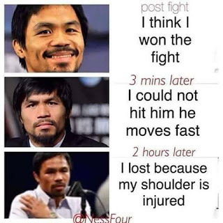 "Pacquiao was healthy in that fight. The shoulder injury was a lie. He just wanted to get doped u on that bs so he could power through those shots. Psh."
