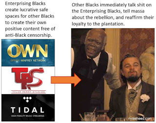 Muhammad Rasheed - @Aminah...Should I blame the producers? The talent isn't really driving the vision of the industry as a whole, since it's the naked billionaire owners that determine which talent gets hired and pushed forward into the distribution/consumption machine, based on whatever their corporate agenda dictates. Is some of that talent guilty of that hating on the enterprising artists trying to break free from the plantation? Sure, but it's the art-killing vision of the moneyed owners that is the root cause of the problem here.