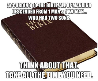 Muhammad Rasheed - Danny, the point of the meme is not valid considering only the disbeliever jumped to the unreasonable and absurd conclusion that Adam & Eve only sired two male children. The point of that story was that the one brother's offering was received over the other brother's because of their attitude in the giving. There was no reason to go into what their home lives looked like. Much irrelevant material was left out of the story, yet the meme creator felt he knew all that he needed to know in order to make his assumption.