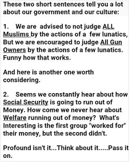 For two, the 'Muslims' reference, combined with the defensive "gun owners" comment, is giving this away as a partisan nonsense talking point... one that i butt heads with all the time. It's saying Obama is a Mooslem that wants to protect his fellow Mooslems, and all the real patriots who support unregulated gun ownership are the real victims, and "all the people on welfare" (code for "blacks") are the problem with gov and our culture. #bringBackTheGoodOleDays