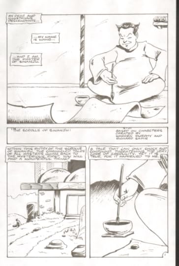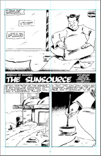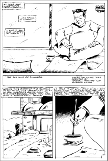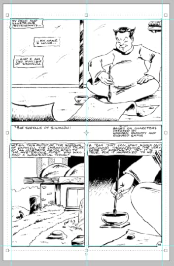 These are the steps I go through to take the finished art work to print-ready file. It's kind of tedious, depending on the number of inking mistakes, special effects, misspellings, and CPU glitches I have to deal with per page. For the most part though this is how the process looks. This page is from Tales of Sinanju: The Destroyer - Book One "Cooking Lesson," page one of the Scrolls of Sinanju tale after the main story.