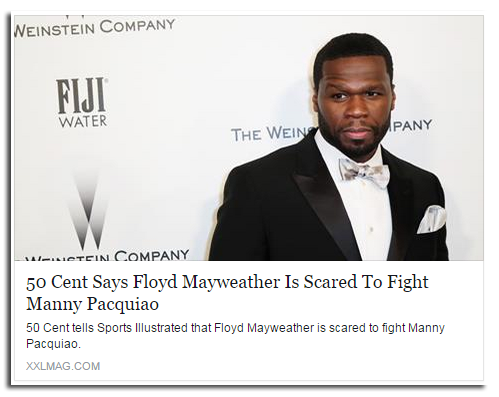 Jerry Lee Brice - ...and you know all of that as a fact because you read it on the internet?!?!LOL...50 Cent knows this brother, we don't.I will take the word of a man that actually knows the person he is dissing over the stanism's of his stans...Don't blame the messenger 50 just because it makes your dude look scared...maybe try to post a comment on Floyd's wall to build up his backbone so he is a lot less nervous about making this fight..who knows, Floyd may see it?...or post to his Instagram account.50 Cent probably got dudes number, and forwards all these comments to Floyd's phone...WE are just outside observers looking in.