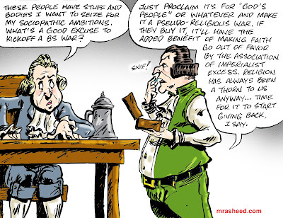 Rasheed, Muhammad. "The True War Against God's Religions." Cartoon. The Official Website of Cartoonist M. Rasheed 08 Jan 2022. Pen & ink w/Adobe Photoshop color.