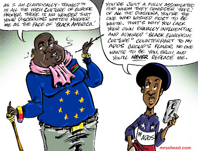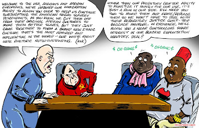 Rasheed, Muhammad. "'Pannies Down': The Decoded True Nature of the Pan-African Grift Scheme." Cartoon. The Official Website of Cartoonist M. Rasheed 16 Jan 2022. Pen & ink w/Adobe Photoshop color.