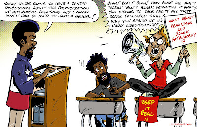 GreenJagWar - No talk of feminism? Why not? Do you think that philosophy may have an issue with stable relationships? If Black women offer the same as any other women why would a man specifically choose her? Feminism in Black is wrong and ruins the relationships between us. Black men have never been 'men' so to treat Black men as patriarchs is incorrect. The enslaved Black population had 'sex' only in a superficial sense, both were treated equally.