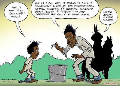 ARTIST'S DESCRIPTIONThis #MRasheedCartoons image was inspired by the so-called "Five Civilized Tribes" of native Americans. Following the lead of the Euro-conquerors, these tribes also used enslaved Black people to milk wealth from the full teats of King Cotton. After the Civil War, they would eventually decide to pay reparations to their Black freedmen, only for the suspiciously Spanish Caucasoid looking modern native Americans to cut their ties with those Black families to keep their wealth for themselves.