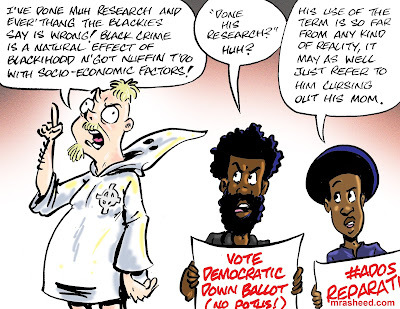ARTIST'S DESCRIPTIONThis #MRasheedCartoons image was inspired by the fact that when racist whites say they have "done der research" it only means they have drank alcohol with their buddies while confirming their biases among one another trading ignorant stereotype-based political talking points. Sometimes one of these ignorant buddies will actually publish a book with this same tripe in it, but whether they all read it or not the effect is the same.