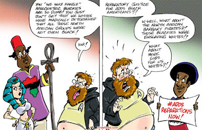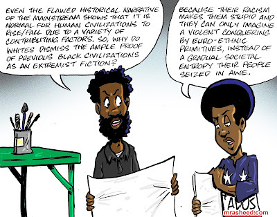 ARTIST'S DESCRIPTIONThis #MRasheedCartoons image was inspired by the never-ending foolishness of the middling white racist who pretending not to understand the normal rise & fall of human civilizations in his effort to preserve the diabolical false narrative of the White Supremacist Ideology. They don't need to keep asking the stupid question of how primitive dog-mouth-licking cave-dwellers managed to conquer the powerful armies of the previous civilization, because they didn't. As the great Black Civilizations their own scholars referenced again and again in their writings even only a century ago succumbed to normal entropic decay, the next group merely seized the remnants to build upon in their own way. It's actually not hard, unless you're too racist and stupid to see what is straight & plain. smh