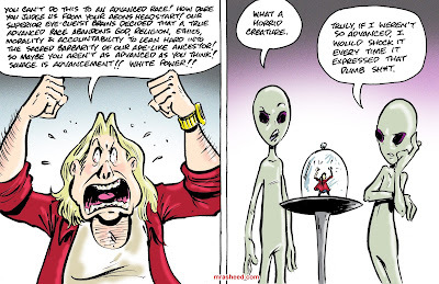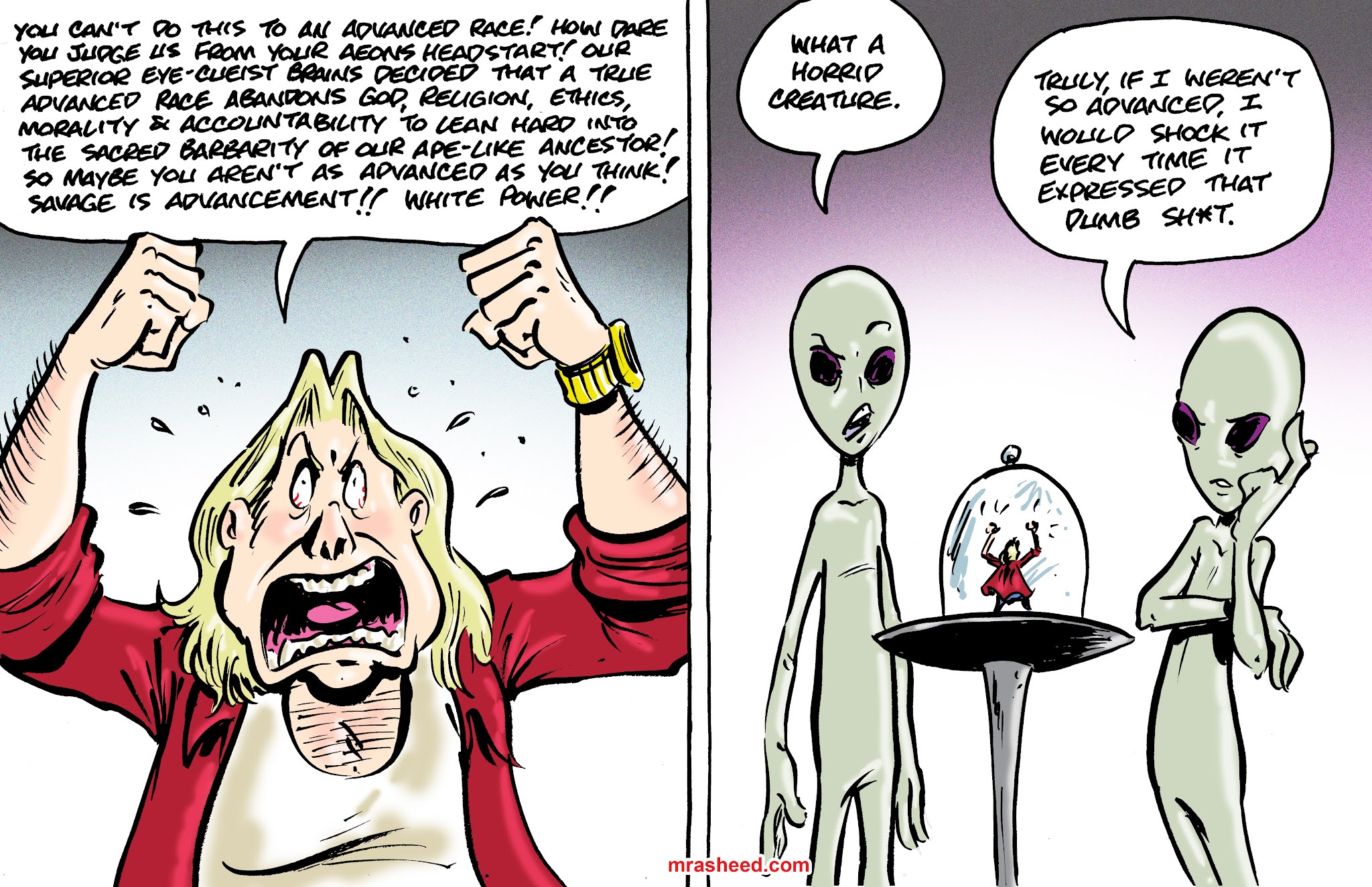 ARTIST'S DESCRIPTIONThis #MRasheedCartoons image was inspired by, of course, yet more middling white racist complaints about my #WhenTheAliensCome series, where I explain the true nature of an "advanced sentient species" consists of far more than the "most advanced at being a barbaric, selfish, violent monkey" concept that the white racist aristocracy self-servingly wants everyone to accept at face value. I reject your nonsensical "divine-evolved white people pagan religion" out of hand.
