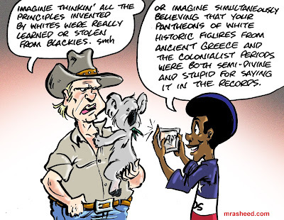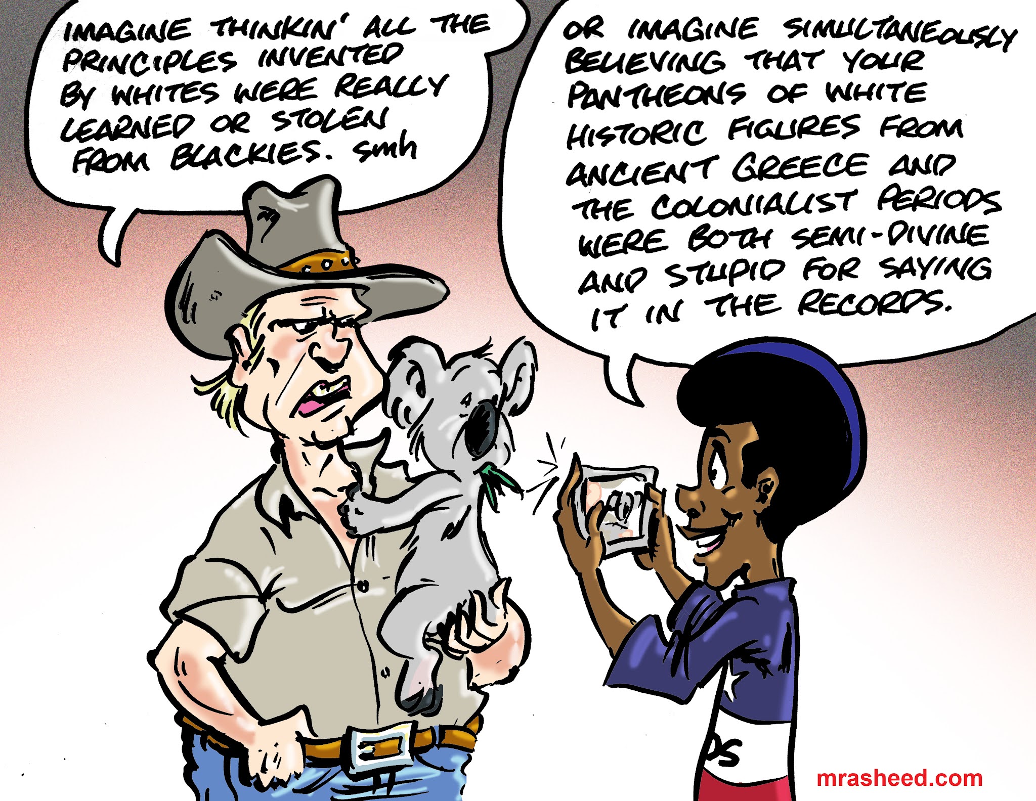 ARTIST'S DESCRIPTIONThis #MRasheedCartoons image was inspired by more foreign white racists of the middling ranks, passionately spewing their white supremacist propaganda about how it was the whites who brought the world civilization. The historical record doesn't support this at all, of course, with the most revealing aspects of that history being the rather recent parts of that history -- the transitional period where we find writings of the Euro-tribesmen themselves casually admitting to the truths their fellows would later commit to covering up. Some of my favorite of these quotes are listed below: