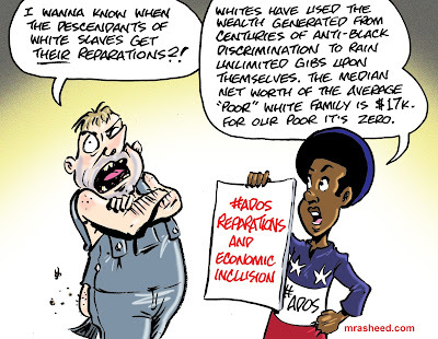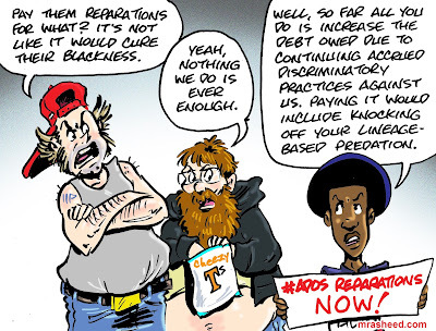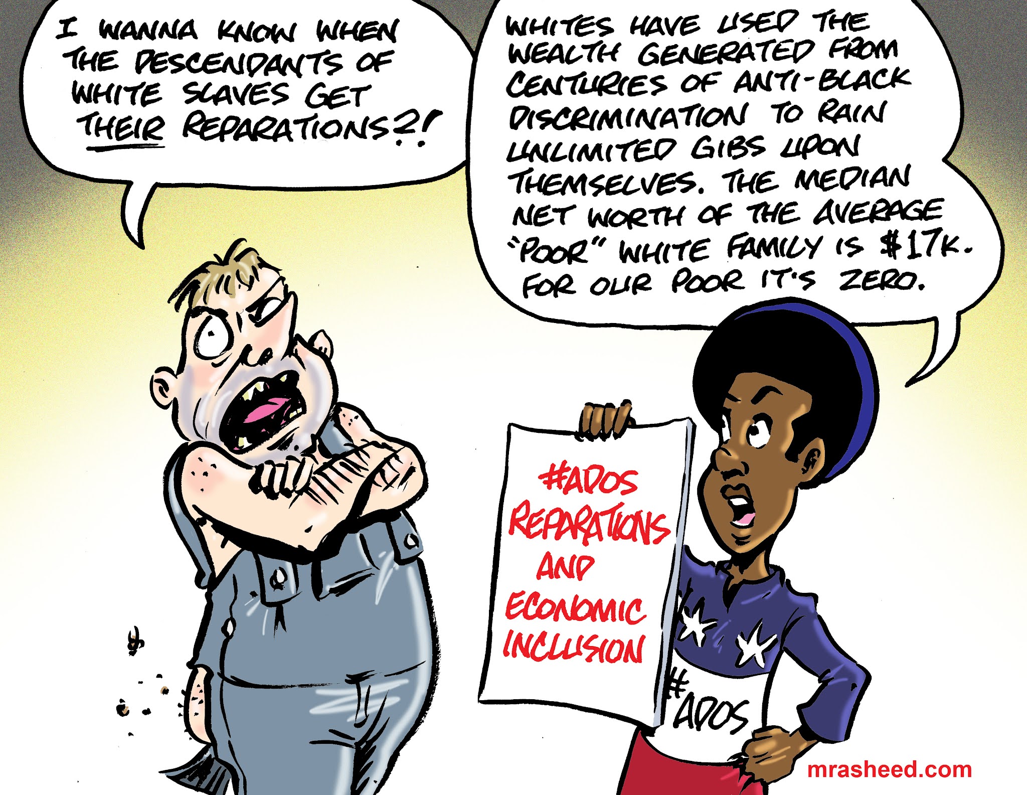 ARTIST'S DESCRIPTIONThis #MRasheedCartoons image was inspired by the fact that white people have not only committed to their centuries-long tradition of subjugating, exploiting & plundering the Black American former slave class to steal our inheritance wealth with various forms of accrued, lineage-based discriminatory practices, but they have used the ill-gotten ADOS wealth to give themselves a double portion of wealth to pass down to their spoiled & entitled kids. That means that even the "poor white" can be found sitting on land he owns outright (covered in over-grown weeds and bullet hole-ridden beer cans) that his family either acquired through homesteading free government gifts, or he just stole it from an ADOS family with impunity.