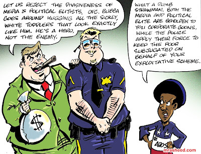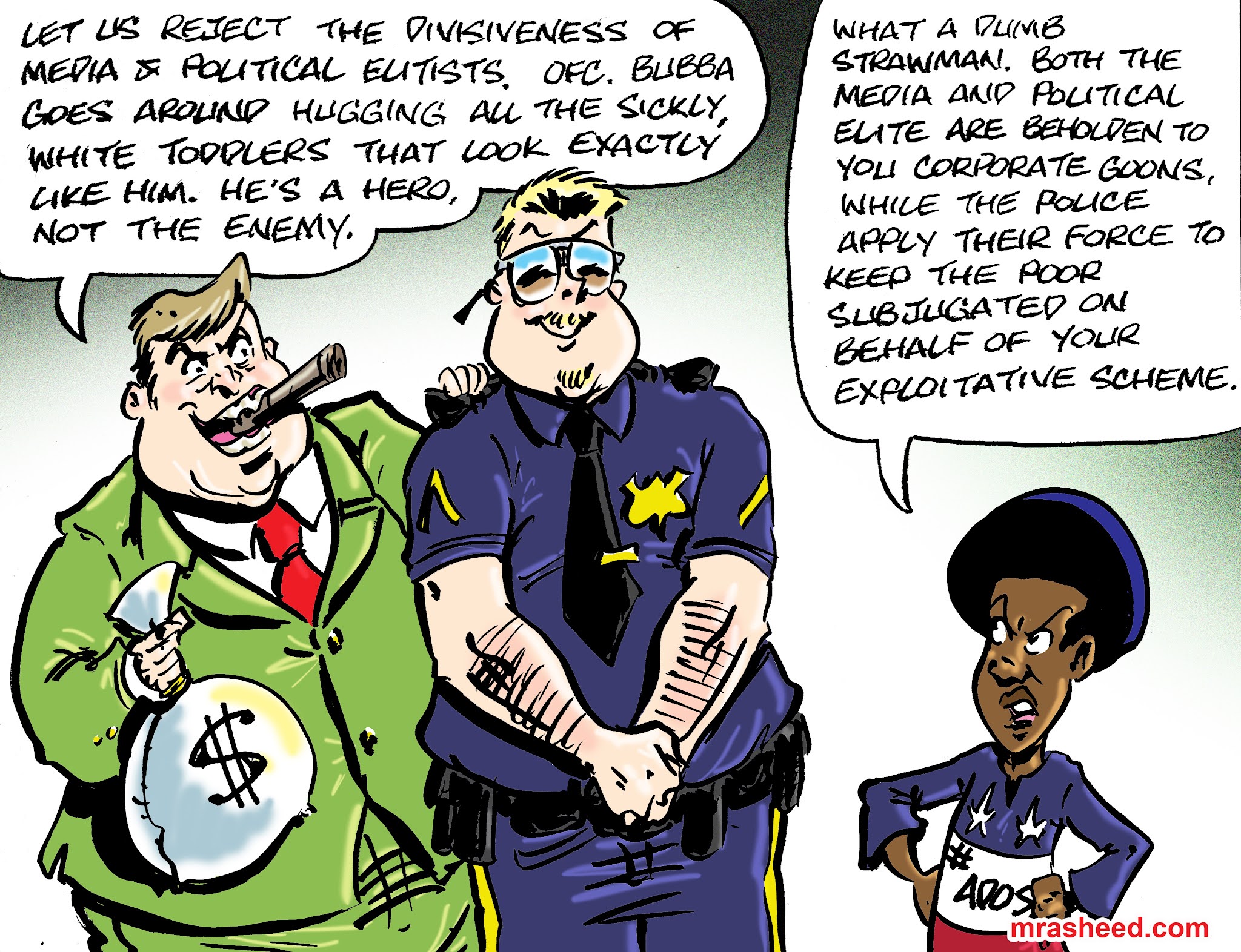 ARTIST'S DESCRIPTIONThis #MRasheedCartoons image was inspired by some silly article I saw on social media that was using the contrived marketing campaign of showing uniformed cops hip-hop dancing with Black kids and doing magic tricks for white toddler cancer patients as some kind of proof that the Law & Order doctrine of LBJ isn't still being enforced. Instead of doing the right thing and paying out Reparations, closing the lineage-based wealth gap and economically including the American descendants of slavery, they instead double-double on subjugating us for continued plunder of our inheritance wealth and using the cops to suppress the blowback with terror and violence. Of course this perpetuates the demonic American culture of criminalizing ADOS for the for-profit prison industrial complex and destruction of the Black Family.
