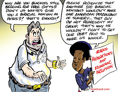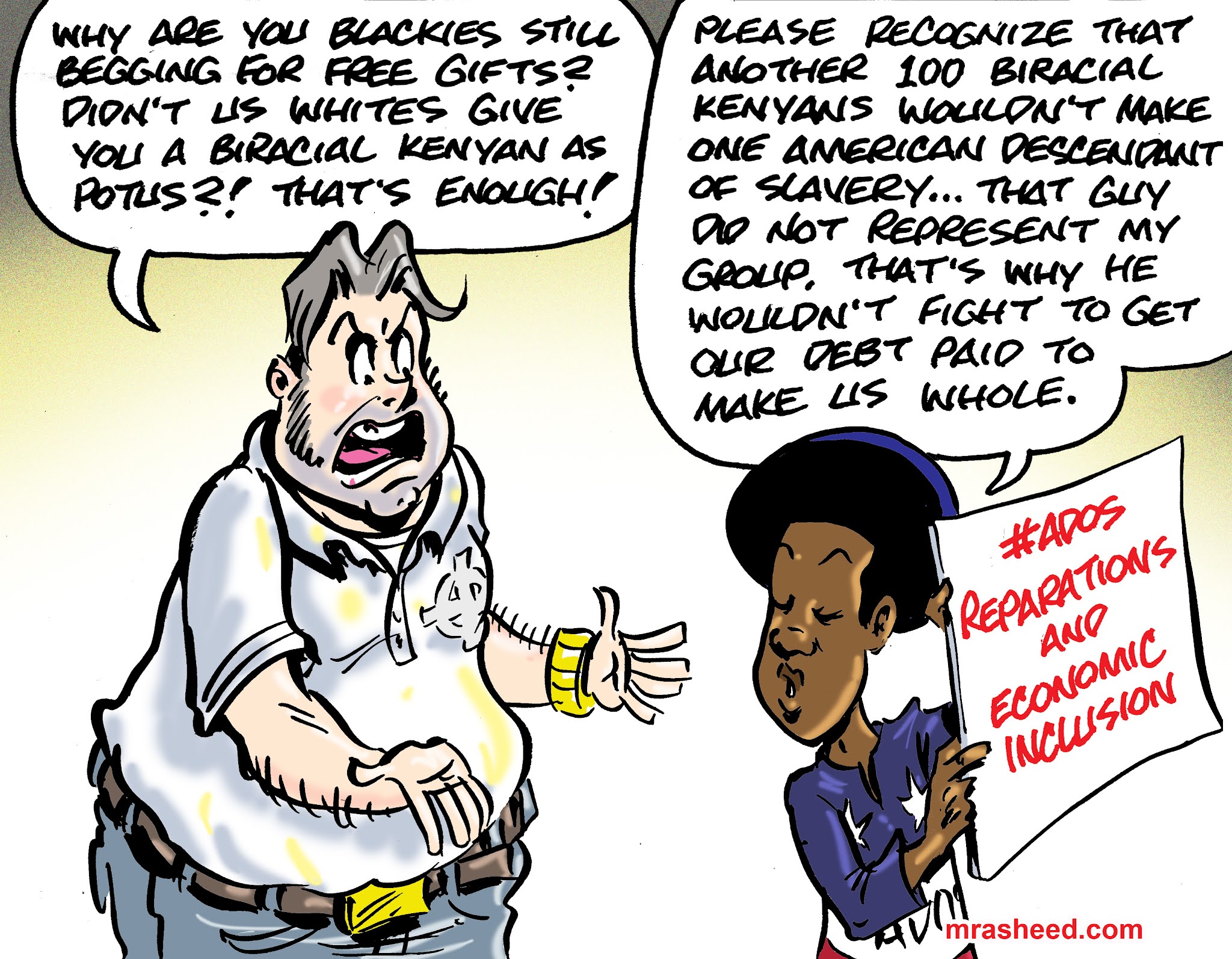 ARTIST'S DESCRIPTIONThis #MRasheedCartoons image was inspired by the middling white racist propping up everyone's favorite anti-Black American, but pro-immigrant First Black President as some kind of fake ("Now we're even!") prize for the American descendants of slavery, despite the fact that he was opening patronizing and hostile towards us while giving all of our rivals everything they wanted. This included being complicit in the mortgage crisis that deliberately targeted the assets of Black Baby Boomers to transfer what little wealth we had over the the whites. Obama was no friend of ours.