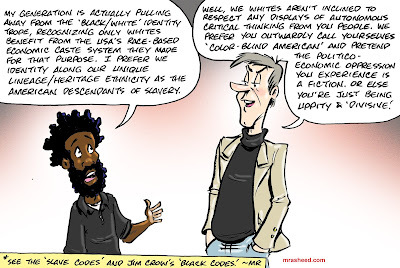 ARTIST'S DESCRIPTIONThis #MRasheedCartoons image was inspired by the fact that all other groups identify along their unique lineages & heritages, and thanks to the data-driven awareness efforts of the ADOS Advocacy Foundation, more and more Black Americans are abandoning the "flat black" label and doing the same. Interestingly, in a colossal demonstration of lack of integrity and yet more grifting performances, the white community has been trying to hide from their complicity in the generations of accrued lineage-based discriminatory practices against us by simply denying racism is even a thing, or even that Black people made it up and do it just to divide America or whatever. When they see us taking on the American Descendants of Slavery label to reasonably identify as an ethnic group instead of a color, they try to say that's somehow wrong, too...