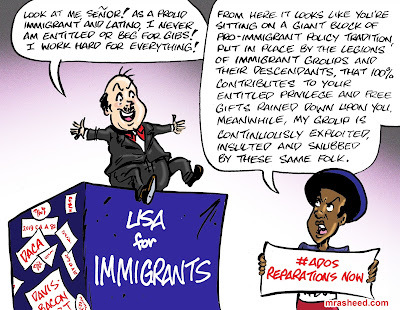 ARTIST'S DESCRIPTIONThis #MRasheedCartoons image was inspired by the comments made by an arrogant latino propagandist I briefly engaged within a LinkedIn argument who was more than happy to spew the politically fabricated talking points that the 300+ million immigrants and their descendants who make up the majority of the USA's populace sing about themselves all the time. Naturally, they do this while disparaging my American descendants of slavery ethnic group, the only one who didn't come to this country deliberately (unless you would like to pretend that the currently self-identifying native Americans really are the original indigenous peoples). The immigrant class is fully in charge of US policies... a large eclectic group composed of numerous colluding ethnicities and nationalities jockeying for positions of power among themselves, while all stepping on ADOS to leverage themselves favorably.