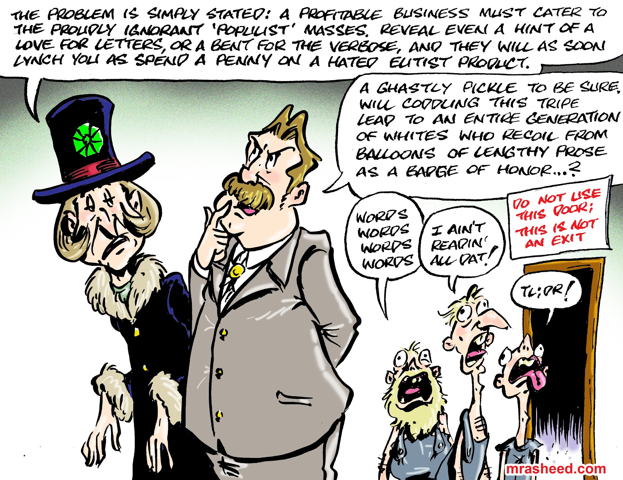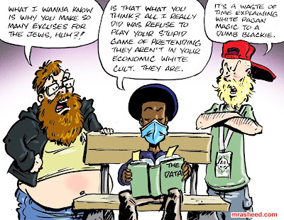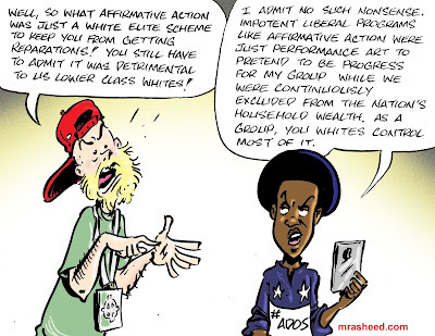 ARTIST'S DESCRIPTIONThis #MRasheedCartoons image was inspired by middling and lower caste members of the white racist aristocracy -- who have spent the last 400 years stealing my ethnic group's inheritance wealth with government complicit accrued discriminatory practices -- who actually expect me to feel sorry and sympathize with them for being lower on the 'whiteness' racketeering criminal overclass politico-economic ladder than they want to be. In a hierarchal system their political identity group designed to benefit them over me, they want me to feel sorry for them because certain of the traps designed to pretend I'm not being discriminated against might have a bit of negative spillover onto them. GTFOOMF