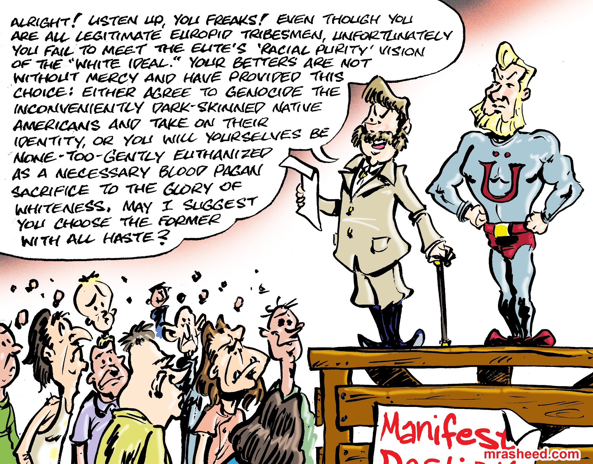 ARTIST'S DESCRIPTIONThis #MRasheedCartoons image was inspired by the fact that whenever the white racist aristocracy proselytizer is back into a corner with the relentless and undeniable power of facts & truth, they eventually are forced to admit their entire self-serving apparatus is little more than a racketeering criminal overclass that functions of the best psychopathic violence and mass media manipulation ill-gotten money can buy, and despite the converging lines of unique situations that enabled the rise of European Imperialism to come to pass, they do abandon their nonsensical magically super-evolved white pagan rhetoric to flip it into acting like what they've done in the last 500 yrs was what everyone was doing, they just did it "better." Huh?
